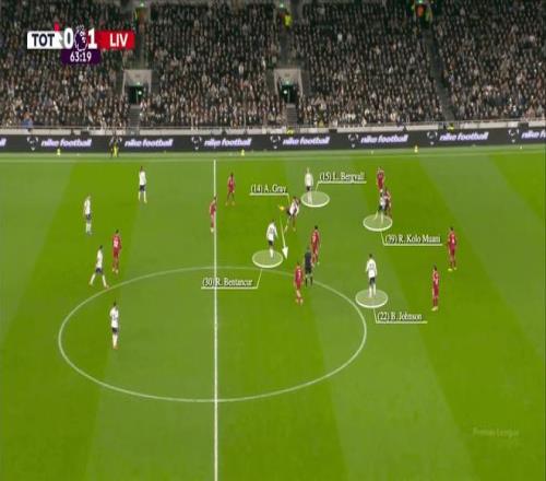 以下示例来自12月1-2负于利物浦的比赛,展示了这种进攻组织模式的一次成功运用。门将维卡里奥长传至中场,阿奇-格雷将球点给罗德里戈-本坦库尔。穆阿尼牵制住科纳特,而布伦南-约翰逊和卢卡斯-贝里瓦尔的站位阻止了利物浦后卫的上抢。